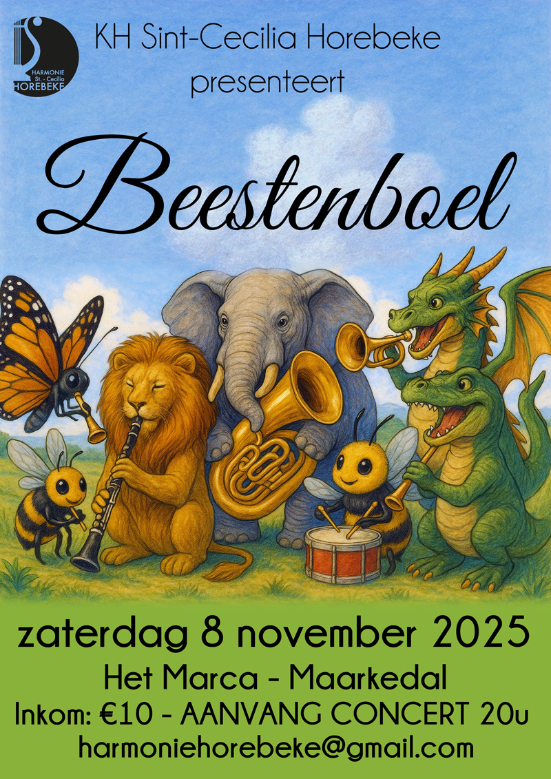 Met als thema Beestenboel willen de muzikanten en hun dirigent Cary De Clercq op harmonieuze wijze de luisteraars meevoeren naar de wereld van de kleinste dieren in Microtopia tot de meest imposante dieren die ooit bestaan hebben en de meest kleurrijke fantasiedieren.